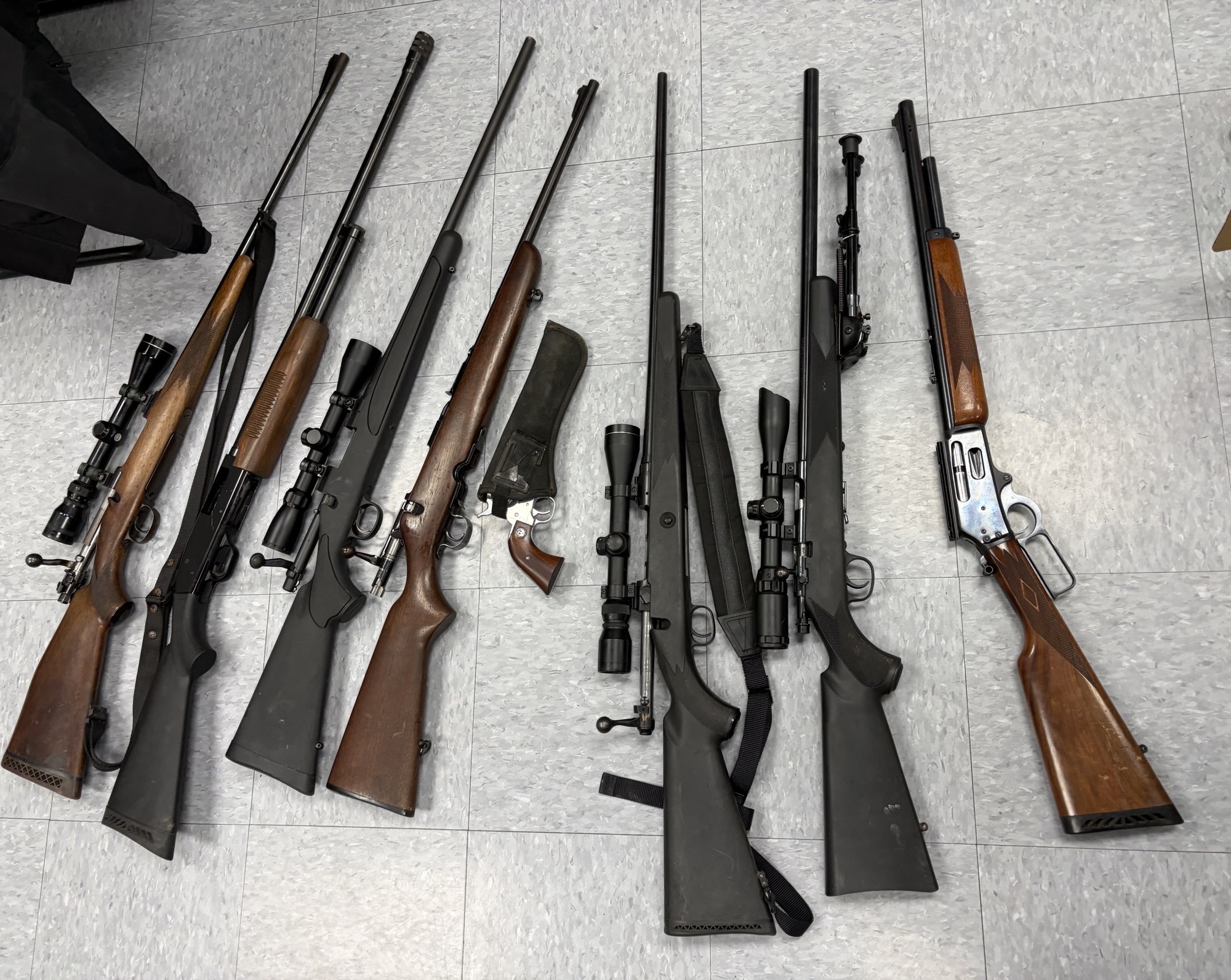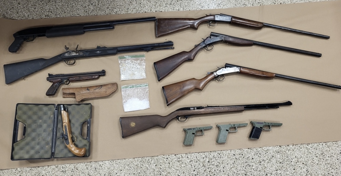Following a joint investigation, Office of Attorney General Bureau of Narcotics Investigation agents and state police conducted a traffic stop Monday in Houtzdale. Police seized 16 firearms — five without serial numbers — along with methamphetamine.